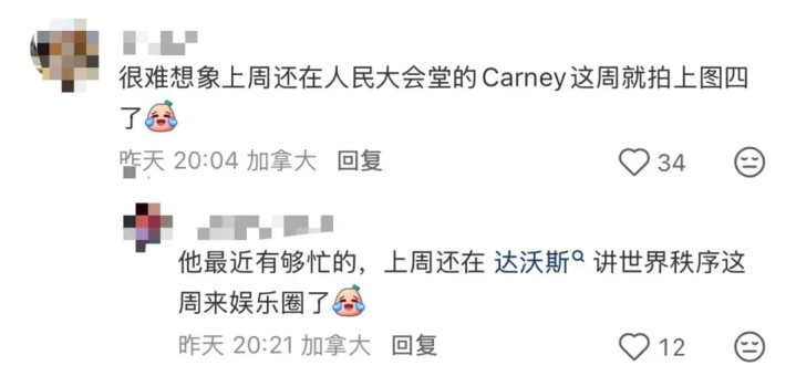 也有网友调侃卡尼:“很难现象卡尼前不久还严肃地在北京开会,现在就拍上这种图了。”、“卡尼也是好起来了,抱上了Heated Rivalry的大腿。”
