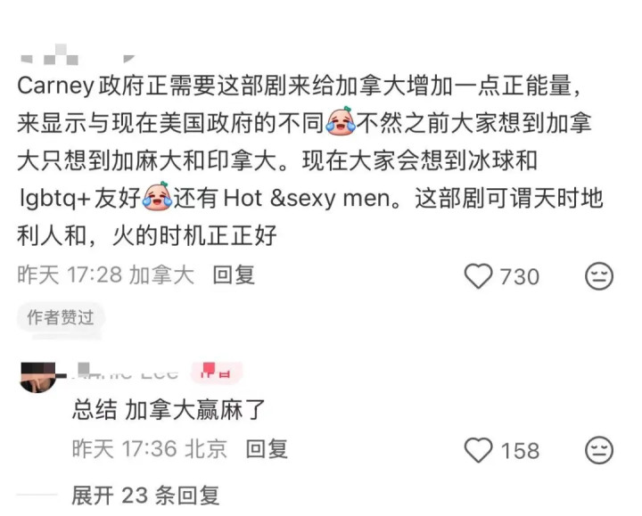 网友A评论道:“卡尼政府正需要这样一部剧来为加拿大注入正能量,以此展现与美国政府的差异。”