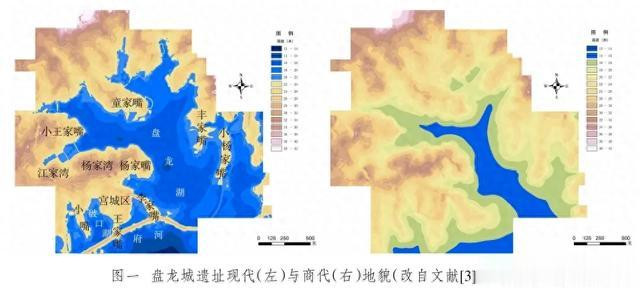 遗址所处区域在宏观地貌上属于大别山余脉与江汉平原之间的过渡地带,整体地势北高南低。具体而言,盘龙城位于长江支流府河以北的临湖低岗之上,遗址内镶嵌着盘龙湖、破口湖,南部以人工大堤与府河相隔[2]。现今盘龙城遗址所在岗地被湖汊分隔得较为破碎,遗址内各地点沿用了当地对小地貌单元的命名(图一,左)。夏商时期水位低于现代数米,现今条岗之间的湖汊当时应为联通的陆地(图一,右),连续的岗地给盘龙城的聚落发展提供了基础[3]。